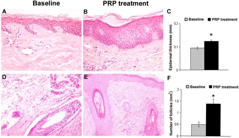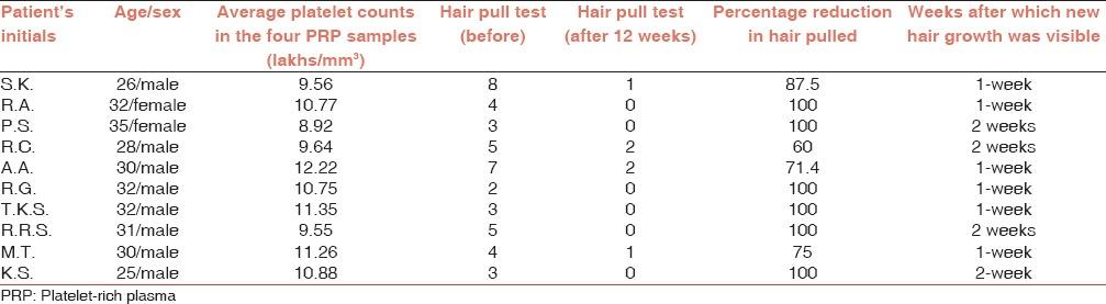 המשתתפים היו 26 מתנדבים עם שיער דק שקיבלו חמישה טיפולים מקומיים של 3 מ"ל PRP (קבוצת המחקר, 13 משתתפים) וקבוצה שניה שקיבלה סליין (ביקורת, 13 משתתפים) במרווחים של 2-3 שבועות והוערכו עבור 12 שבועות. אזורים שהוזרקו כללו אתרים חזיתיים או פריאטליים עם שיער דק. צולמו אזורי ניסוי ובקרה. משתתפים אשר הביעו הסכמה לכך, עברו ביופסיות לבדיקה היסטולוגית. הבדלים משמעותיים נראו בחתך שיער אך לא במספר השיערות. ממצאים מיקרוסקופיים הראו אפיתל מעובה, שגשוג של סיבי קולגן ופיברובלסטים והגדלת כלי הדם סביב הזקיקים. לקראית המחקר לחץ כאן.